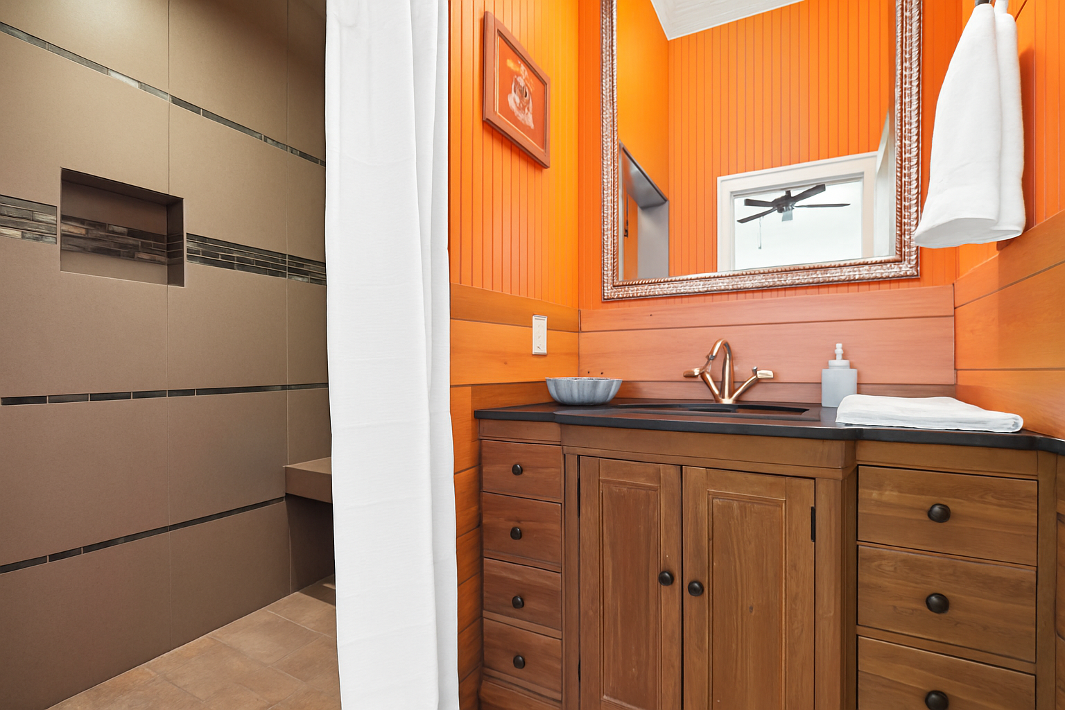 This suite features a king bed, balcony, private full bath with a walk-in shower, and a large closet equipped with a pack ’n play and luggage rack. The room also includes a desk with a monitor and HDMI cable—perfect for work or streaming.